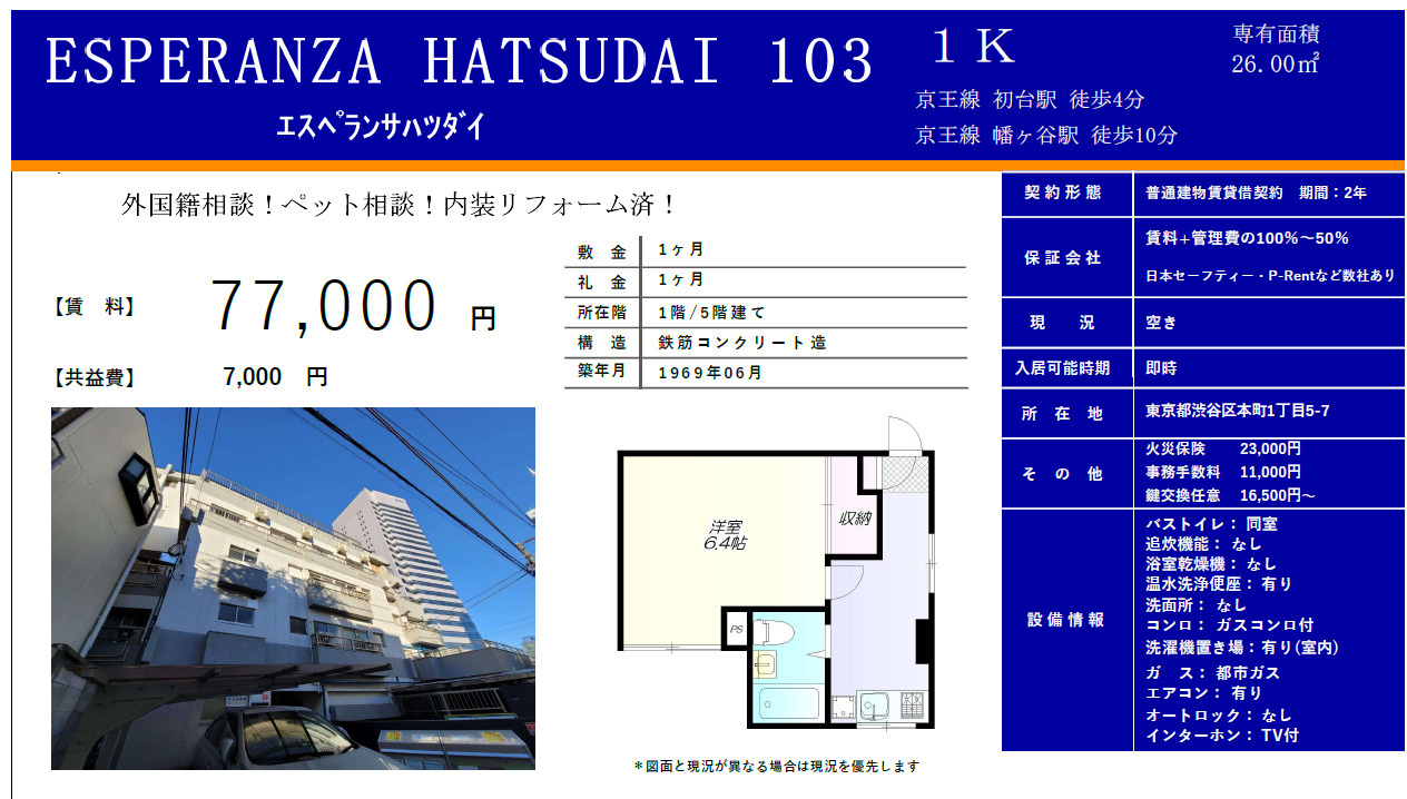 コムハウジング(賃貸) > 株式会社コムハウジングのスタッフブログ記事一覧 > [新着物件]ESPERANZA HATSUDAI103